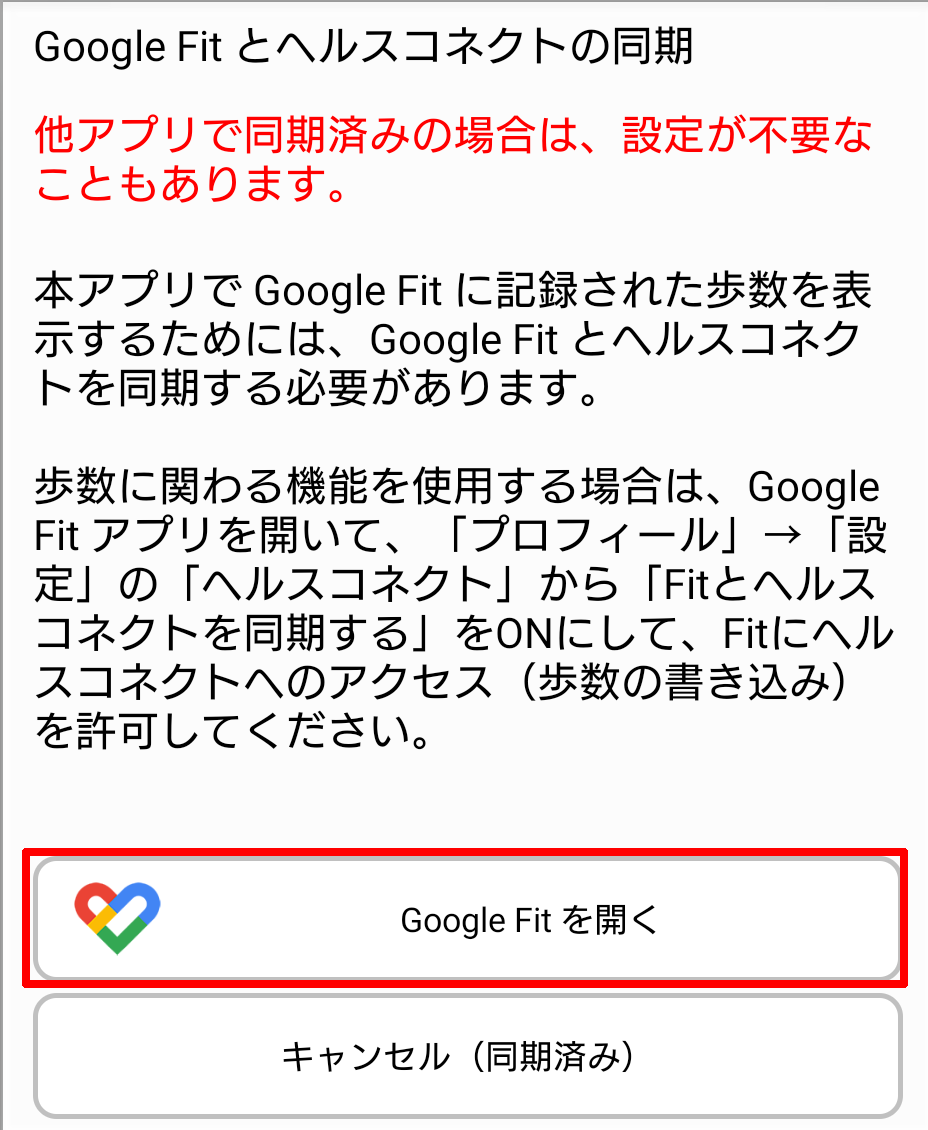 アプリを起動時、歩数記録の設定が完了していない場合は、次のダイアログが表示されます。
