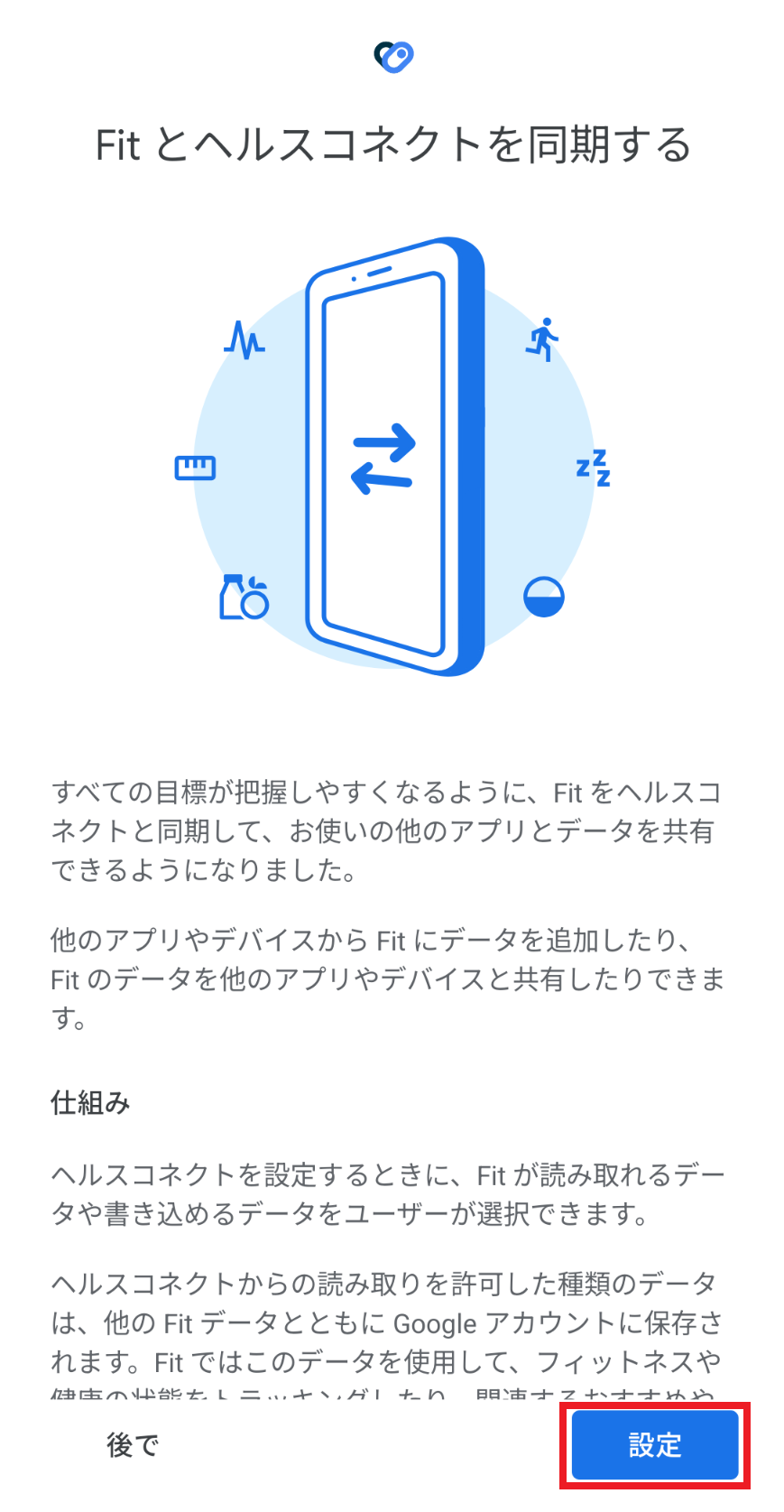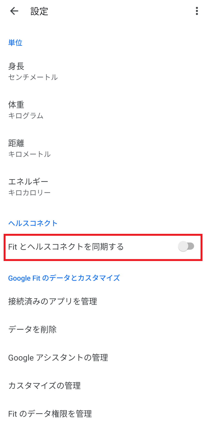 設定から「Fitとヘルスコネクトを同期する」を押してください。