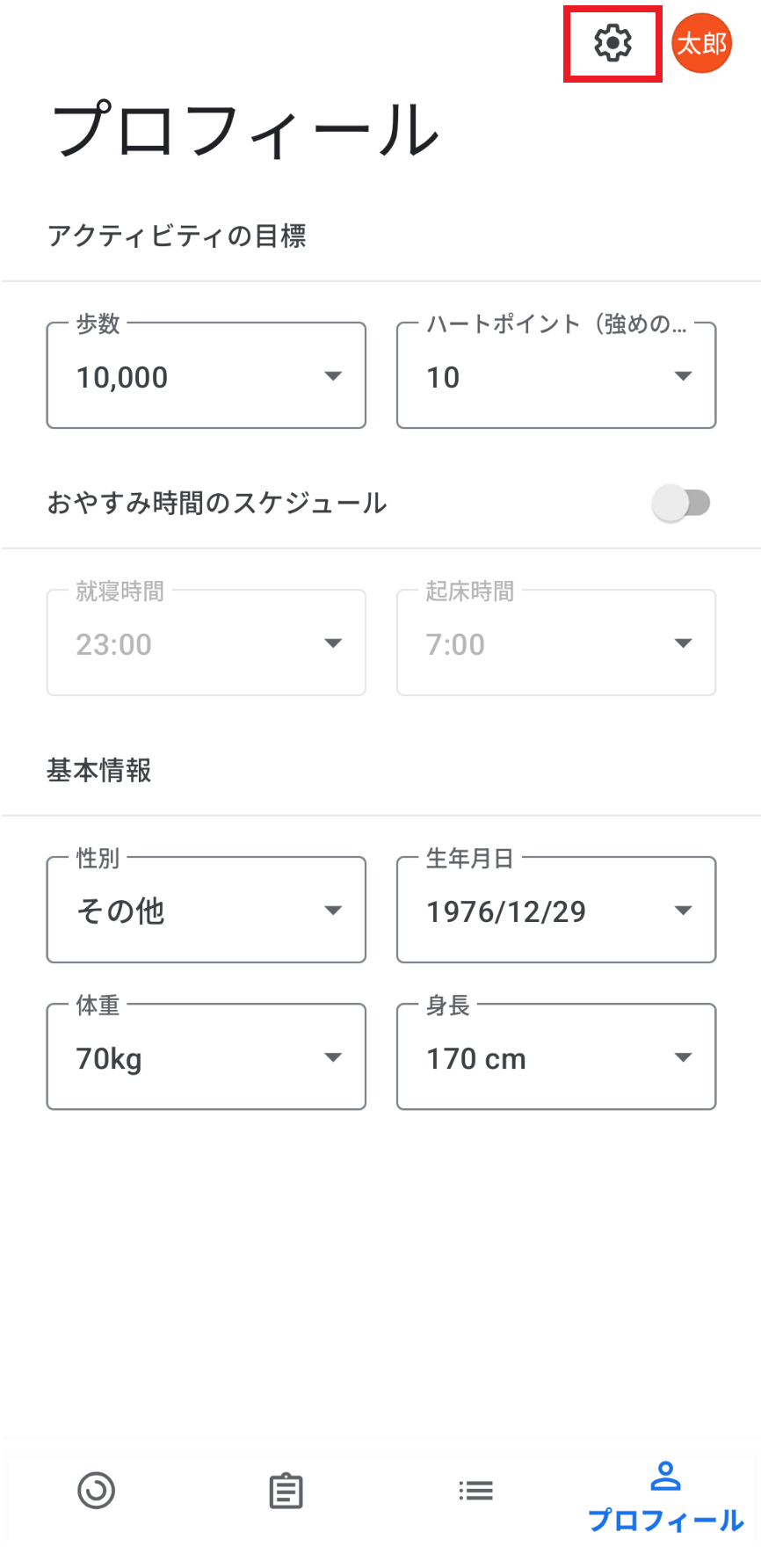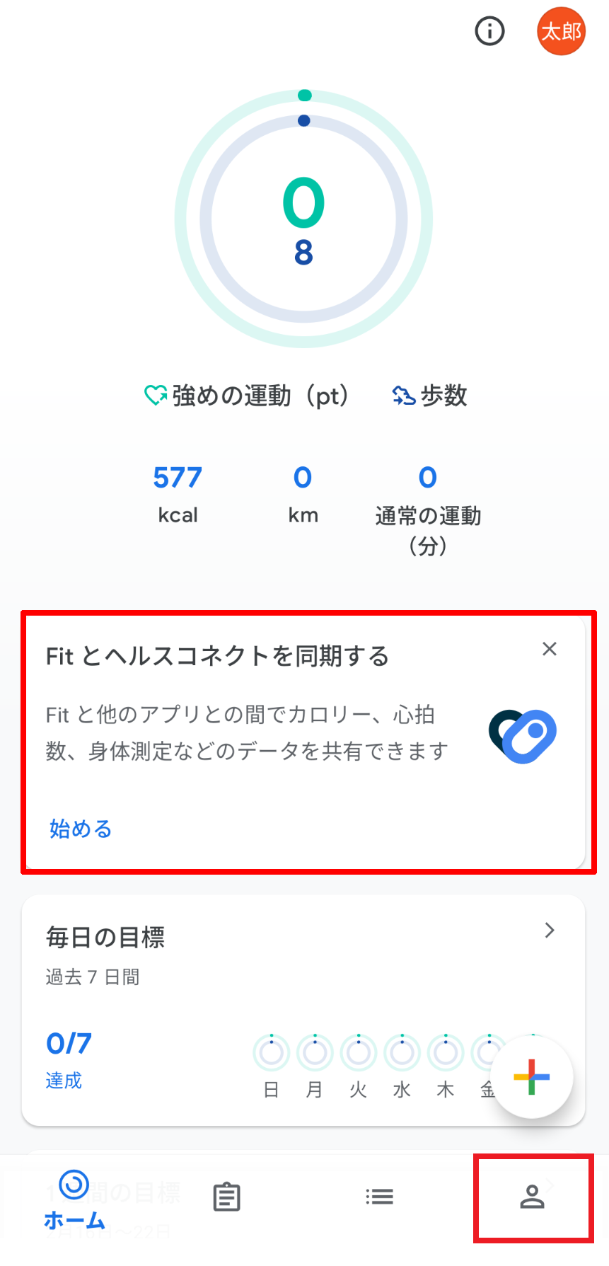 「Fitとヘルスコネクトを同期する」の「始める」か、右下のプロフィール・アイコンを押してください。