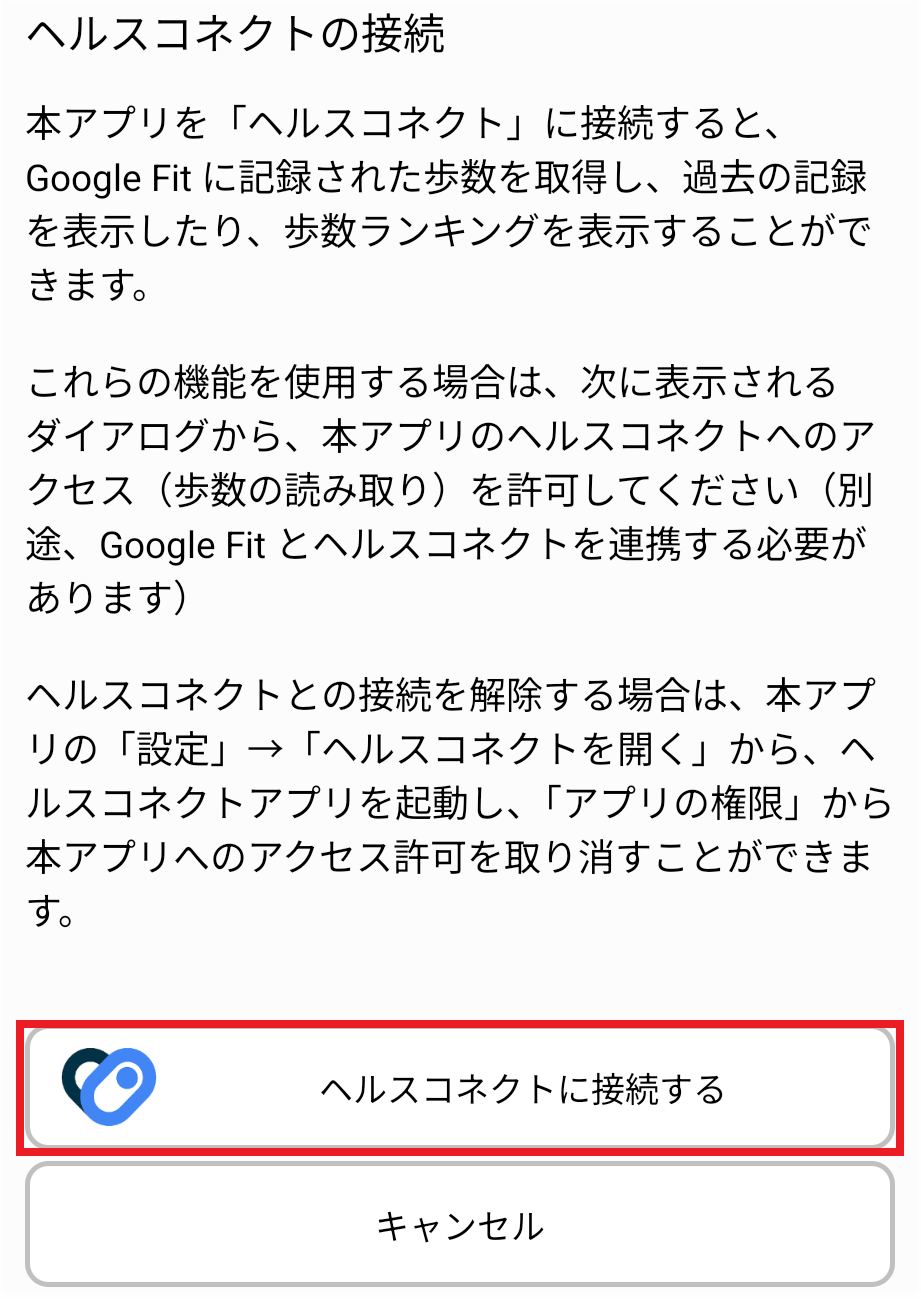 本アプリに、ヘルスコネクトへのアクセスを許可しました。 Google Fit から ヘルスコネクトに同期された歩数を、本アプリで記録できます。