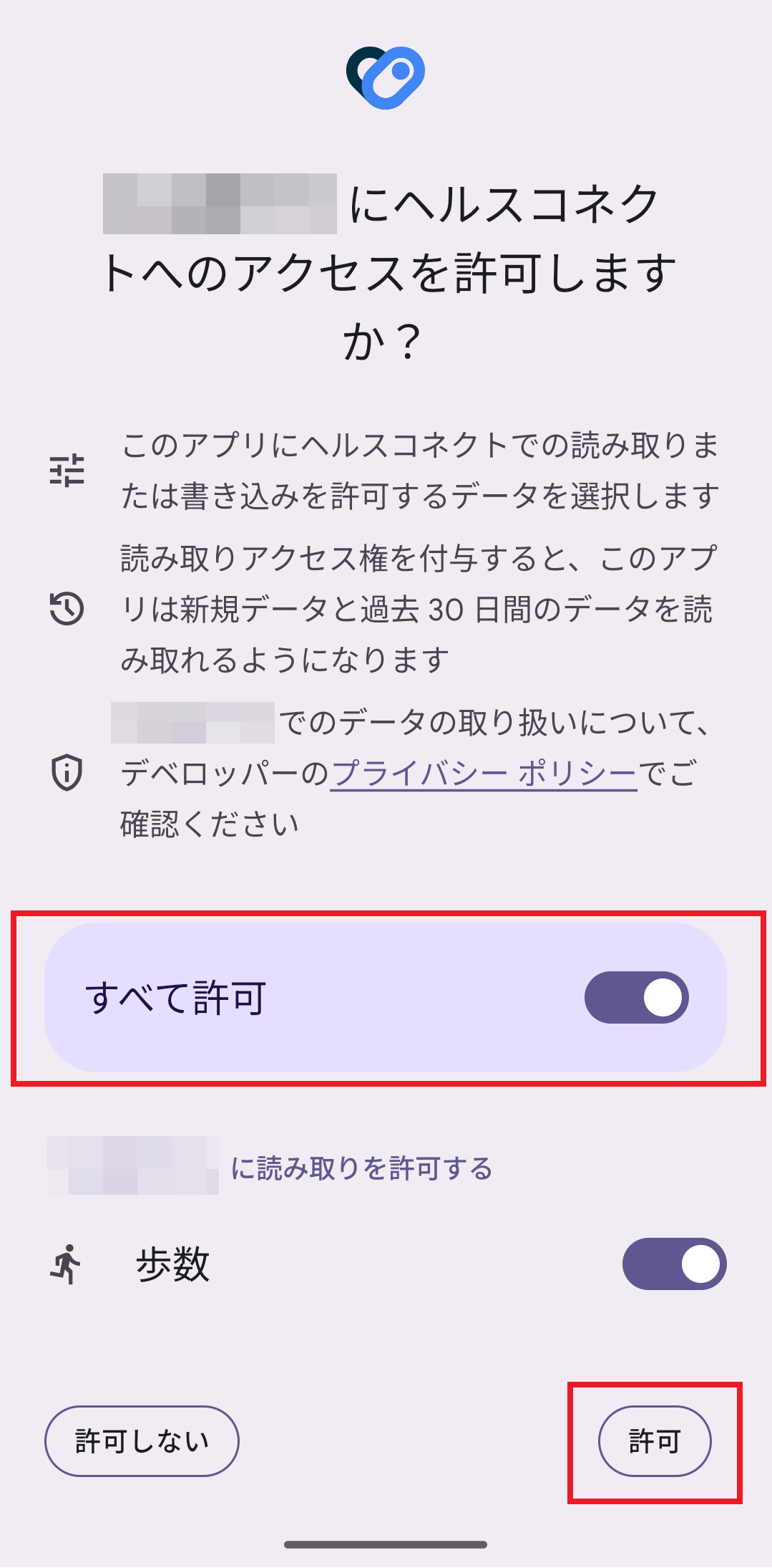「すべて許可」または「歩数」を押して、右下の「許可」を押してください。